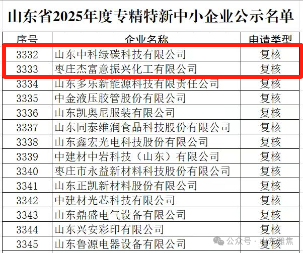 近日,山東省工信廳公布2025 年度專精特新中小企業名單,山東中科綠碳公司、棗莊杰富意公司順利通過復核。
